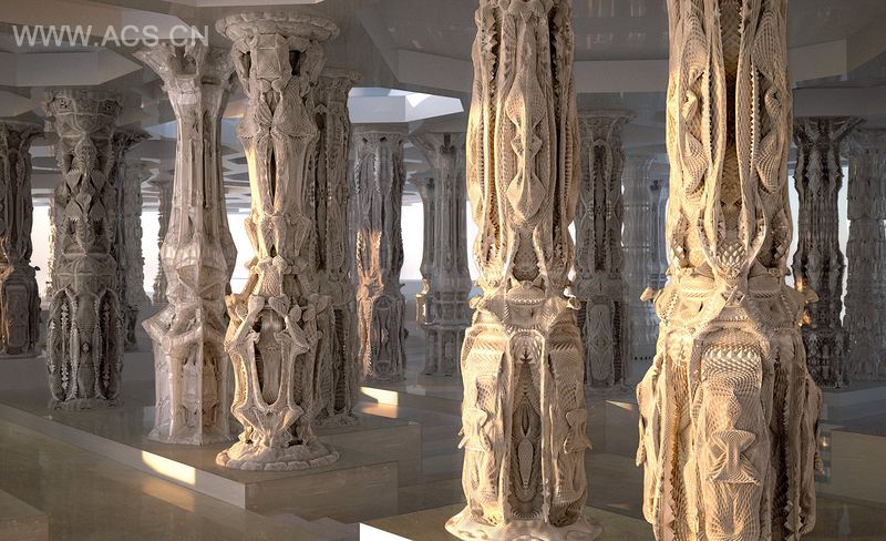 这些柱子是相对一个单轴对称的,从前面或后面看他们的表面都不相同。 这个设计使用的程序保证了多样性的输出。如果没有程序,就这个作品的细节及复杂性来讲,这将是不可想象的创作。