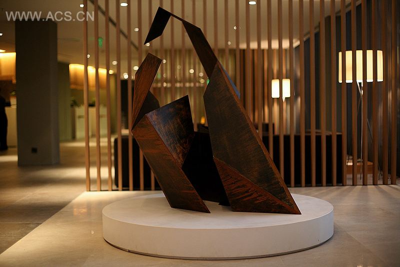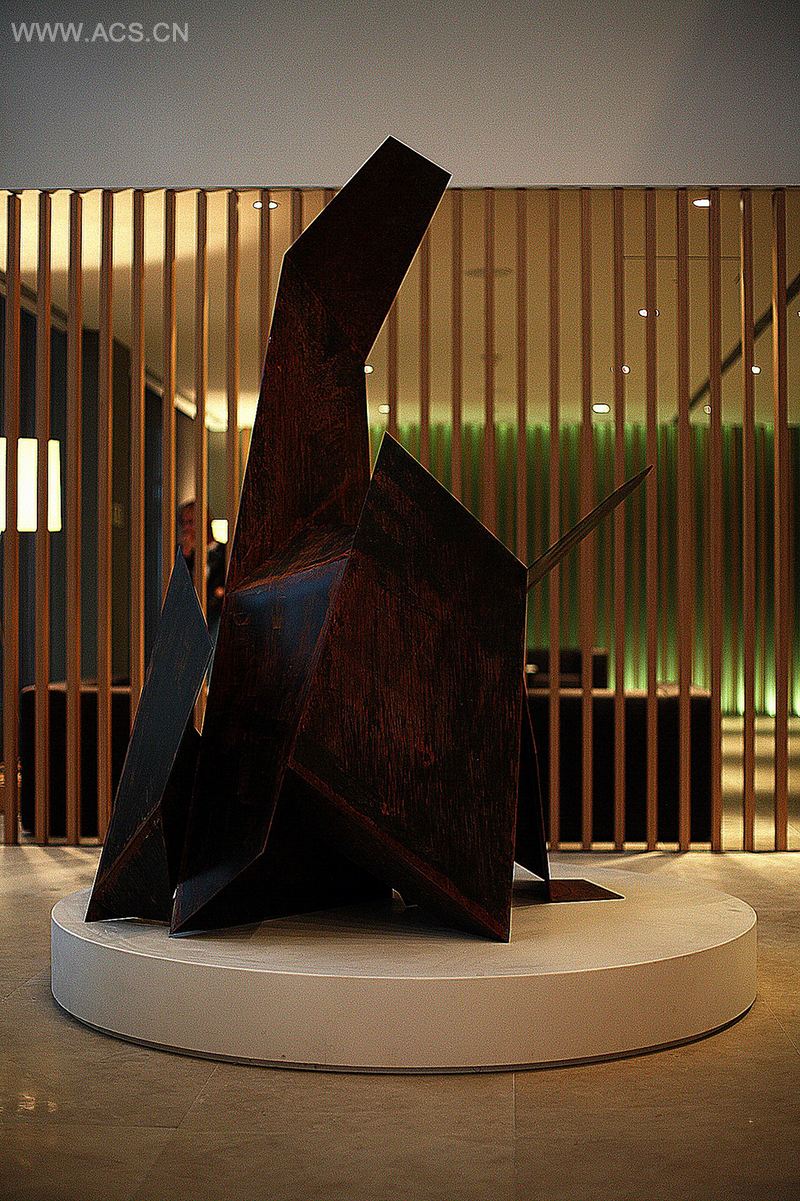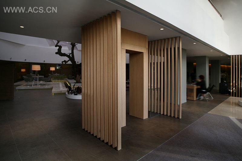 整个大堂面积1400平方米,包括了前台收银区、网吧、商务中心、休闲区、烟草店、洗手间和销售办事处等几大功能机构,这些功能机构往往为大堂空间的充分利用及其氛围的营造提供着良好的客观条件。Tanju Ozelgin 的设计通过聚合自然材料、间接照明和特殊音效,力图营造一个轻松自如的氛围,令到来的客人有宾至如归的体验。大厅内的艺术雕塑线条极为简洁,却显得变异,留给人无限的想象空间。Tanju Ozelgin在设计中还利用了很多的自然材料,比如用椰子皮纤维做成了一个大马蜂窝状的饰品,斜放在一边的墙角,很有现代派的味道,另外还利用枯树干做了一面隔墙,当然它最大的用处还是装饰,但是在移步换景之中,却给人置身于艺术馆的感受。大堂中间位置的设计用到了耐水的植物和整颗的的枯木,并且还在观赏台周围镶嵌了一圈白净的小石子,整个大堂在设计上时刻兼顾着艺术品味与商业生活之间的和谐与平衡。