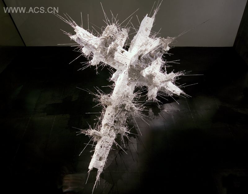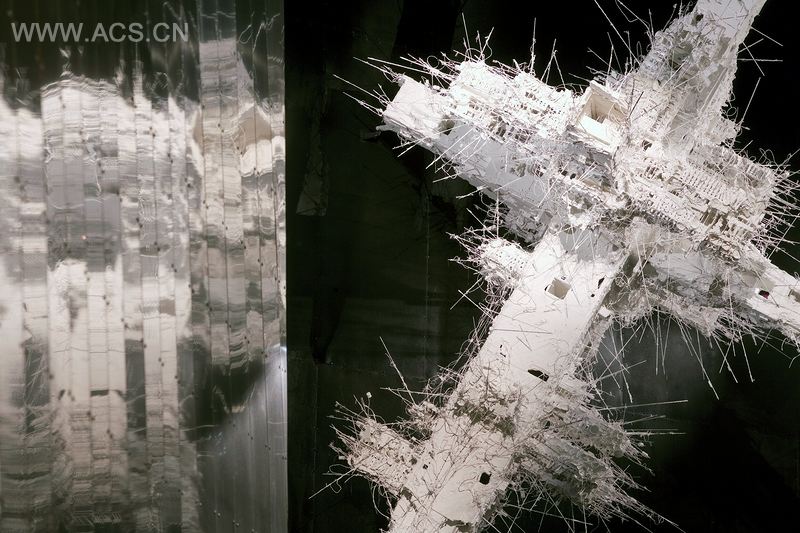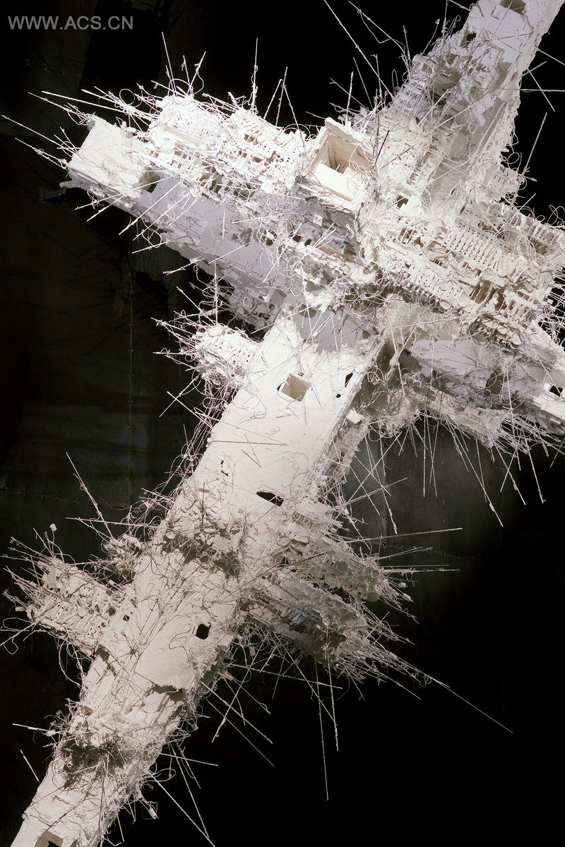 这幅白色的抽象绘画展现的是这个星球愤怒的一面,天灾人祸的残酷场景历历在目,如此概念化又如此视觉化。白色画板上用柔软的石膏创造了一种“存在的缺席”的感觉,而存在了什么,又被移除了什么,却是显而易见的,这种“缺席”深刻地提醒着我们曾经发生过的灾难。杰瑞·犹大把完整的太阳能电池板,水塔以及楼梯进行系统的破坏后,将它们融入到画板的场景中去。泡沫画板的表面涂抹了一层丙烯酸漆,那是一种柔软的白色颜料,漆膜干燥快,附着力也很好,并具有较强的室外耐久力,可在较低的气温下使用,因此它可以保证这些堆积的废墟和撕裂的楼梯可以在空荡荡的画板中垂立起来,这也是杰瑞·犹大对于绘画和雕塑界限的一个挑战。