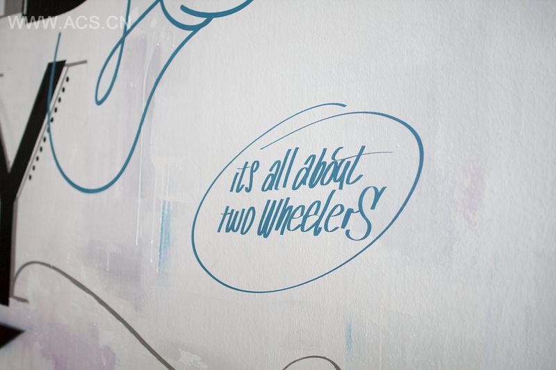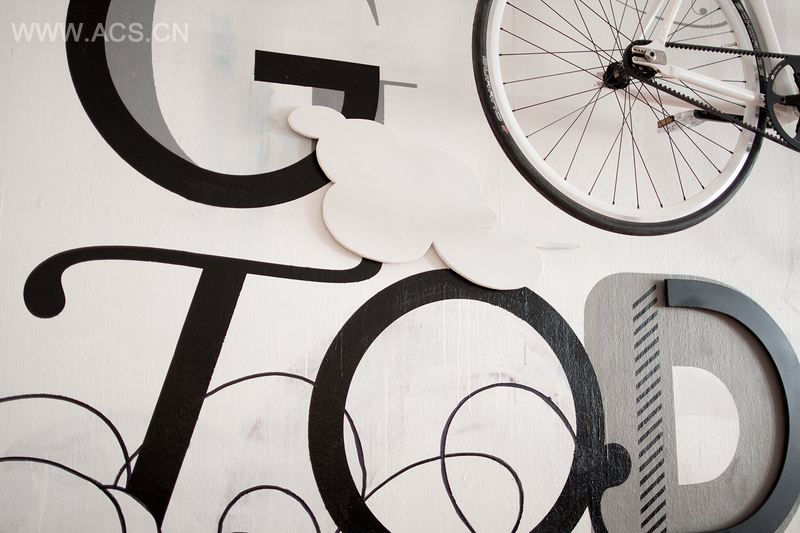 Buschke决定创造一种三维墙面艺术。他选择德国生产商Schindelhauer生产的Viktor白色自行车,简约的设计和前瞻性的碳驱动系统使其成为项目的一个亮点。由这个漂亮的自行车开始,设计师用一些生动的插画,现代字体结合智能化的书写来表现这个作品。从远处看,自行车成了字“I feel good today”的一部分。