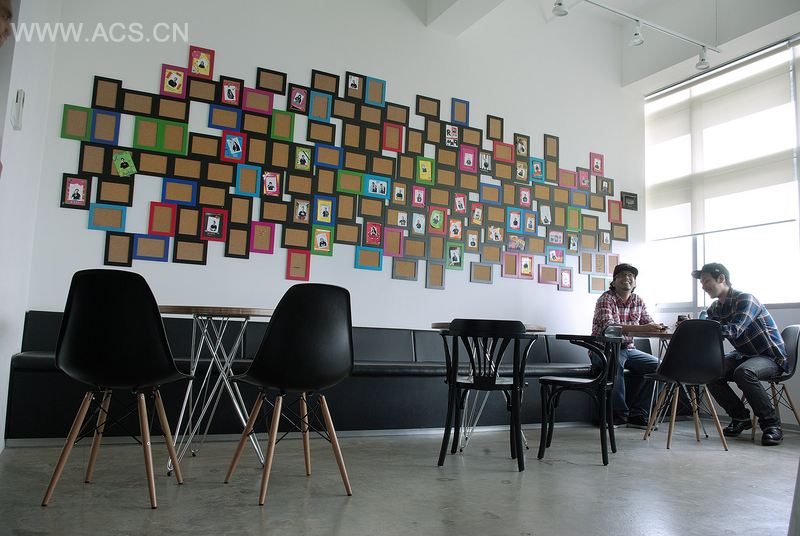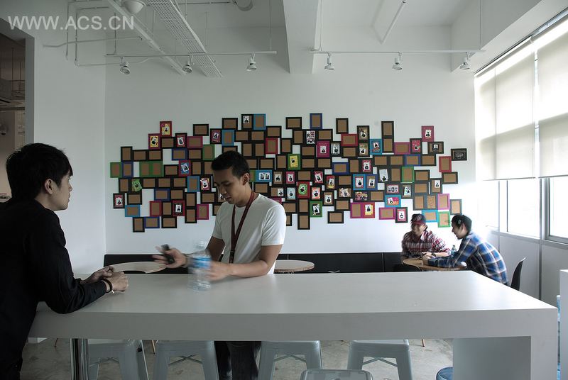 办公区的入口大厅墙上有激发员工创作灵感的作品的交互投影和文字展示。办公区还设有像酒吧吧台一样的讨论区。甚至是图书馆和员工用餐区的空间都被借用出来作为公共讨论区。