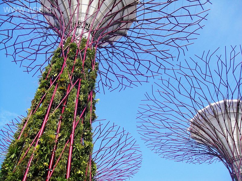 这些擎天巨树的高度在25米到50米之间,由金属和混凝土制成,上面有攀缘的植物以及蕨类植物生长,形成垂直的花园景观,放眼望过去就像一片面积巨大的人造森林。巨树的混凝土树干粗壮,树枝和树冠耗费的盘条达数千根。