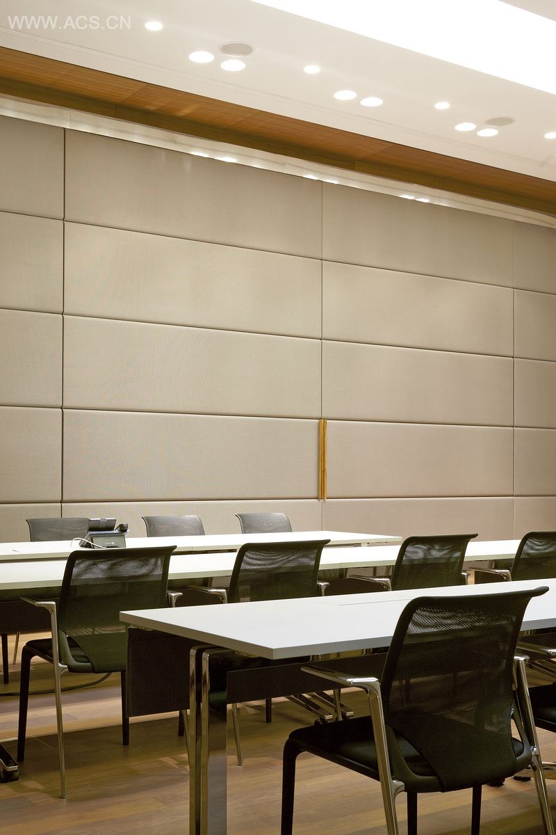 礼堂是本案的亮点之一。室内外的封闭外壳使用的可丽耐,与室内的暖木材料和工艺织物墙面材料相互融合、交相辉映。