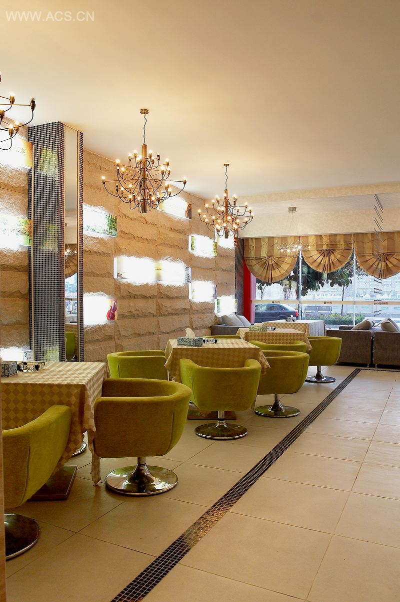 在色彩上,以淡雅清新的嫩绿色、米黄色、白色作为空间最主要的色彩元素。另外造型元素多体现植物的意象,比如树枝造型的吊灯,洽谈区座椅的颜色,植物盆栽,都体现出了大自然清新的气息。