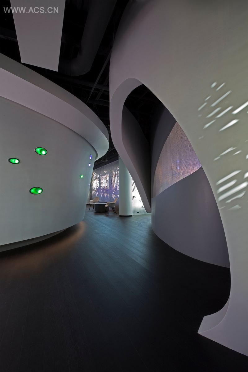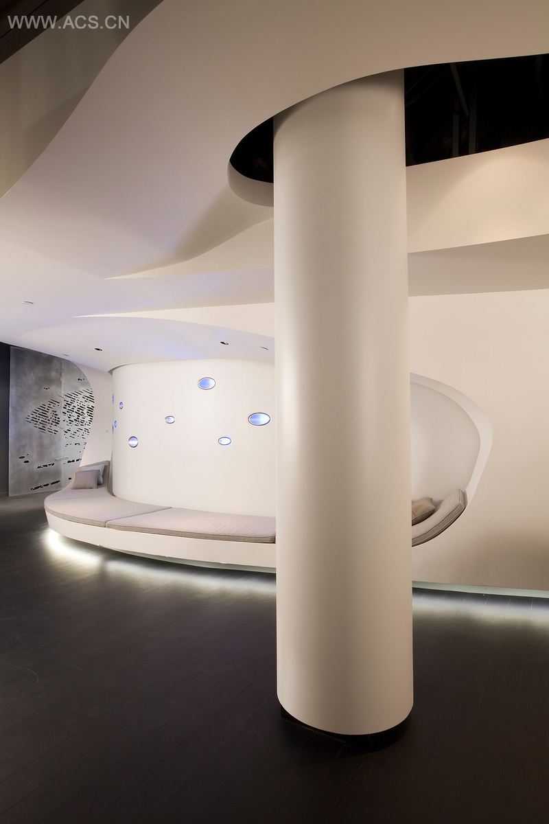 一个有机制作的支架结构蜿蜒穿过整个办公空间,一层表面光洁的围护层包裹着蜿蜒流动的墙面,仿若一件盔甲,保护着里面的电缆线架和机电系统。墙面上的进光口如针般刺透这一有机结构,这样一来进光口内置的LED灯发出的不同颜色的光线,就可以自由通过墙面。设计师们借鉴动画制作的模式,将之运用于激光切割的墙面上和内立面。