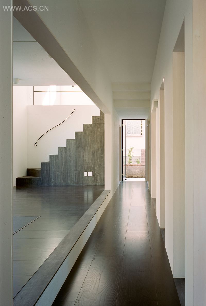 考虑它细长条状的占地特点,设计师将房设计分为三个部分:木质盒状空间、混凝土盒状空间及连接这两个空间的走廊。在日本,这类复式公寓出于对家庭隐私的考虑通常被划分成两个主要部分。但从长远来看这并不是一个合理的想法。