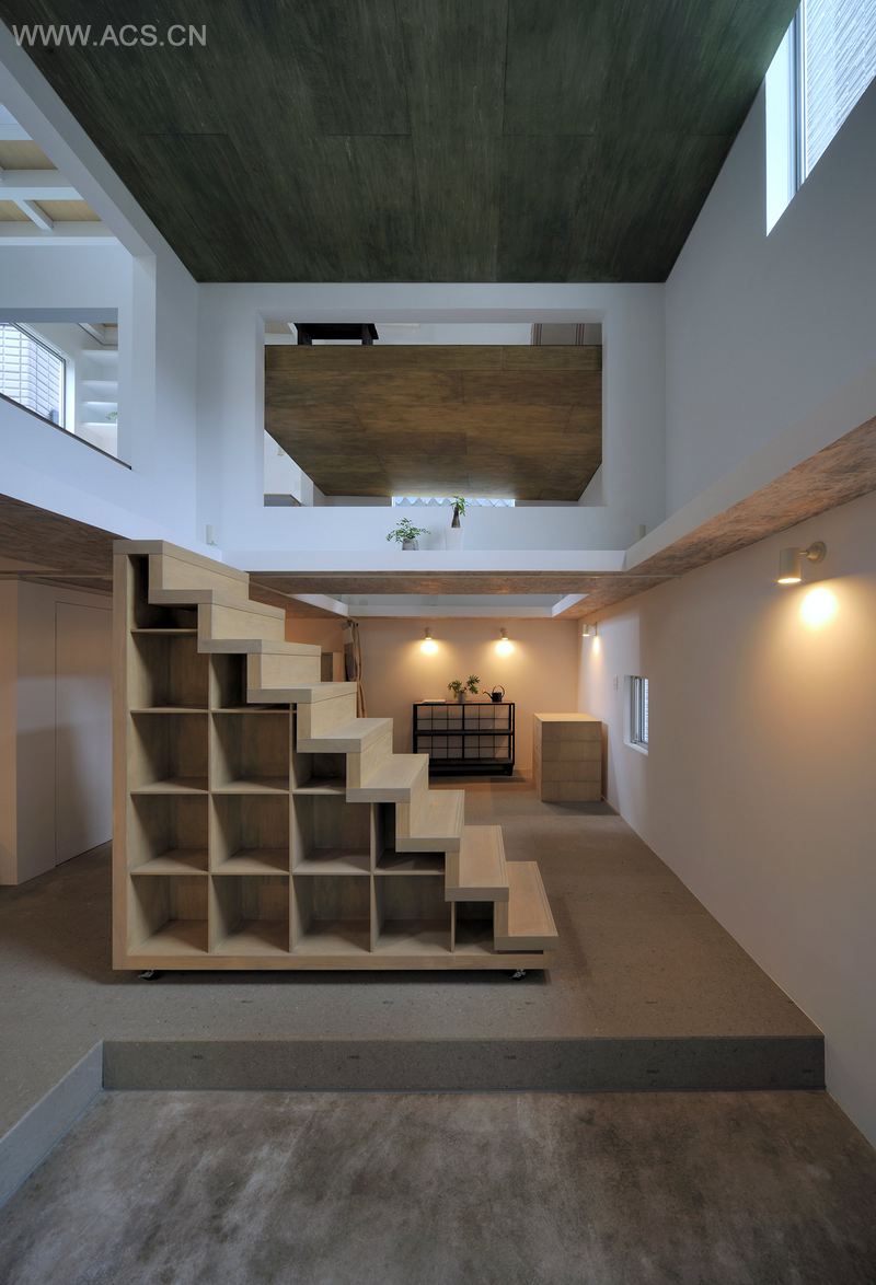 在这个改造过的盒状空间,地板像是书架板材一样被铺设在各个楼层中。各楼层通过摆设不同功能的家具划分出客厅、餐厅、厨房和卧室。每个书架板式的地板仅靠分隔在巨大盒子中部的三维度支柱钩挂固定。这种简单的结构给空间组合带来了更大的活动范围。得益于这个盒状的巨大体积,在各个楼层进行的各项日常活动都能享受开阔的视野。灯具由盒状空间的顶部悬落,为每个楼层营造出一种舞台似的照明效果。这个小小的住宅楼就像一个巨大的展示柜将起居生活展示于舞台之上。