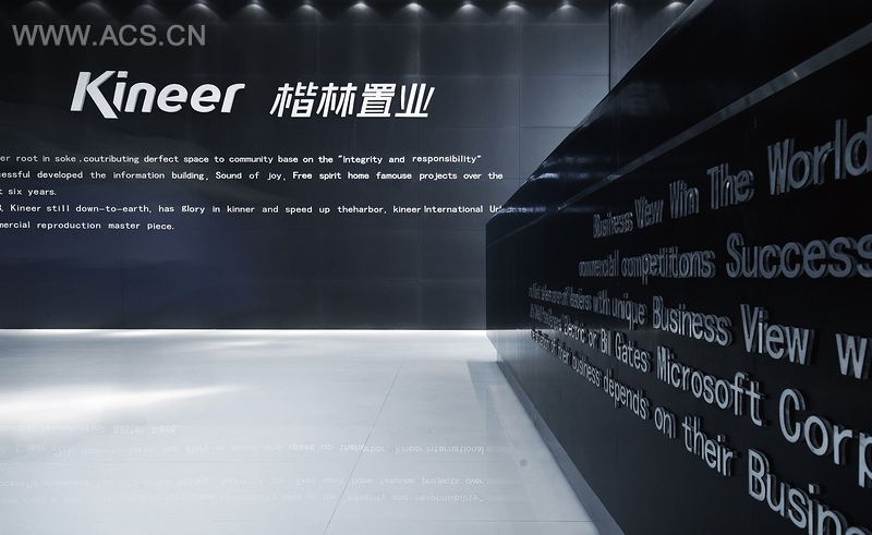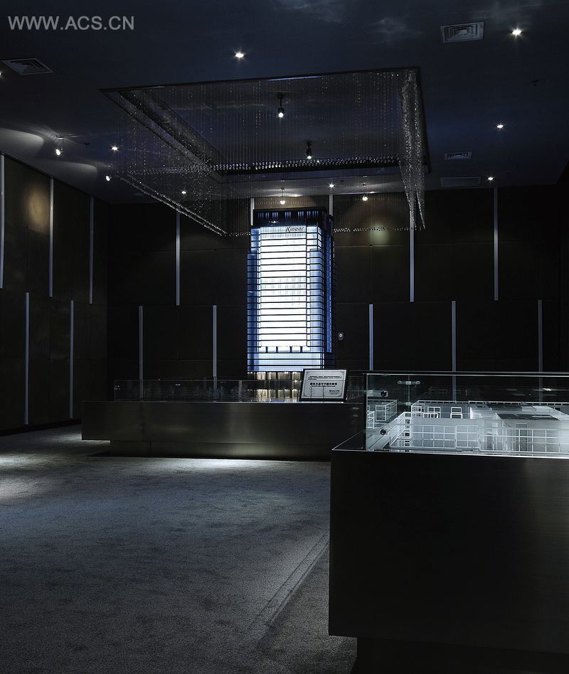 楷林国际作为“郑州长安街”上的高档写字楼,在着力展现现代办公建筑特征的同时,更不忘现代国际流行建筑的八字方针:实用、舒适、美观、节能。大厦将两栋姊妹楼通过中间连接联成一栋塔楼形式,表现了一种明显的国际合作精神,它同时融合了现代与古典的美,突出了写字楼应具有的稳重与进取并存的特点。项目建成后将是一座带有地标性质的现代化智能写字楼。正是由于对项目有着很深的理解,因此在接到业主委托做售楼部设计的时候,捨弃了以往做售楼部常规的流程和手法,以更加商务化和国际化的流线划分空间、规划流程,将空间功能划分为接待,沙盘展示,放映室,楼盘展示,逐步引导参观者去认识建筑,感受建筑,从而达到展示和销售的目的。在设计上更加注重内部秩序的组织和规定,几何的构图,高效的布局,质感的对比,色彩的统一赋予了售楼部独特的个性特征;整个空间展示在一种秩序与规律中有条不紊的进行着,在这里每一个构件和体块既包容联接又清晰独立,从而形成一个明确的层次,不但表达了“舞台”这一概念的强烈主张和立场,也充分渲示着大厦对外表现稳定、庄重、资金充足,信心百倍的特征。