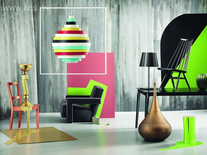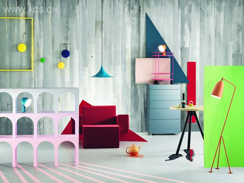这个想法是将环境设置成某种形式的车间,一种有趣的扭曲。摄影师和布景设计师认为结合灰色粗糙的墙壁对比色彩鲜艳的家具和油漆,这样看起来会效果好。布景设计师打算使用那种看上去很像混凝土墙壁的漂亮墙纸,但因为预算有限,他们最后不得不用油漆去创造他们期待的风格。