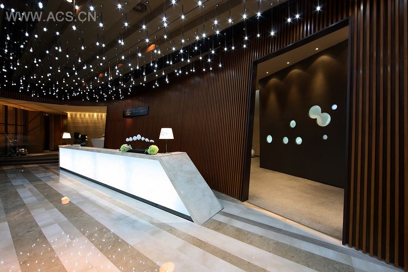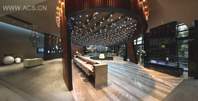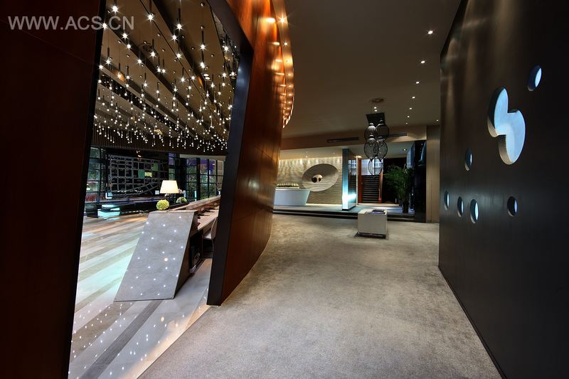 项目位于西安市东二环,‘星星’、‘流水’是本案的设计原始元素,通过空间的分隔及灯光的运用来表现售楼处‘星币传说’的主题。室内采用三维椭圆形体,利用线条强化斜面的动性,打破室内单调的方正空间,使其在功能上更有层次,更具观赏性。在材料上大量采用木线条以及亚克力发光体营造的满天星效果,很好的体现出楼盘的主题及气质。