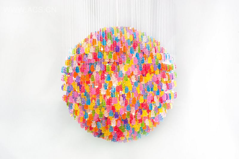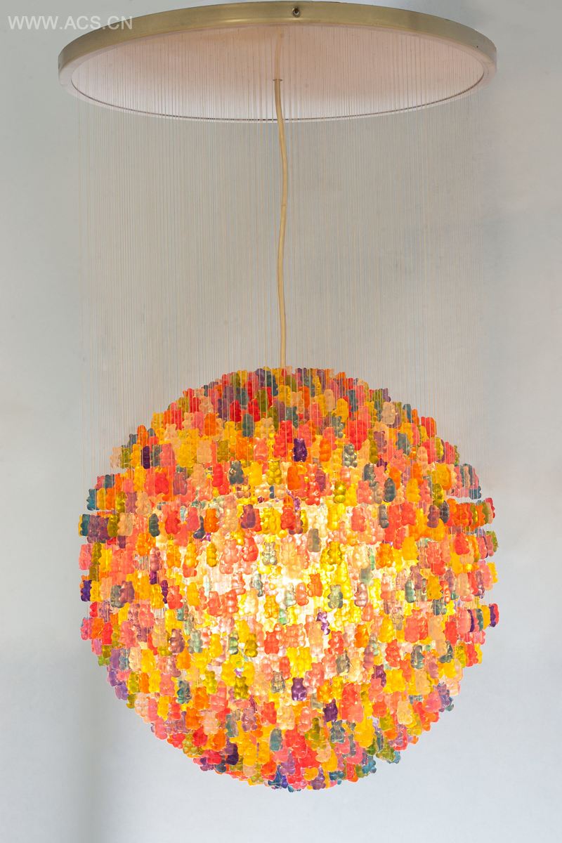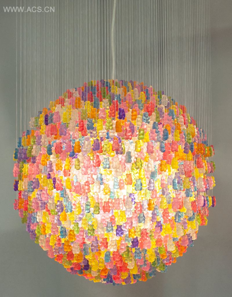 这款小熊吊灯有两种尺寸:直径31英寸及直径18英寸(图片为18英寸)。灯顶与天花板之间相距12英寸。18英寸的吊灯挂有约3000只小熊而31寸的小熊超过8500只。所有的小熊都是手工切割亚克力。我刻出了小熊的最初形态并制作了硅橡胶模具,并在我的工作室中亲手进行浇铸。我为每只小熊穿上线,打上绳结,并用一个小玻璃珠将它固定。小的制作耗时约3周,而大的需要几个月时间。