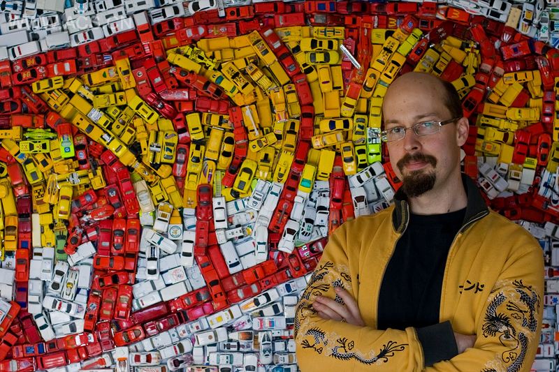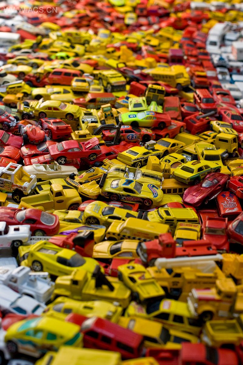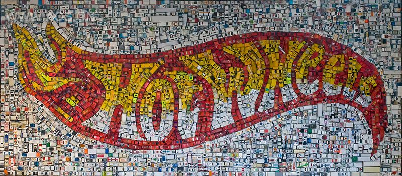 我用4400辆赛车玩具制作出了“风火轮”logo(风火轮是美泰公司的注册商标)。它们超过550磅,9英尺长、4英尺高。这是加拿大一个汽车收集者的客户定制项目,我花费了超过6个月的时间进行创作。每辆车都以最原始的状态呈现,没有经过任何上色。我用胶水黏合起约3层的车来制作出想要的整体效果。