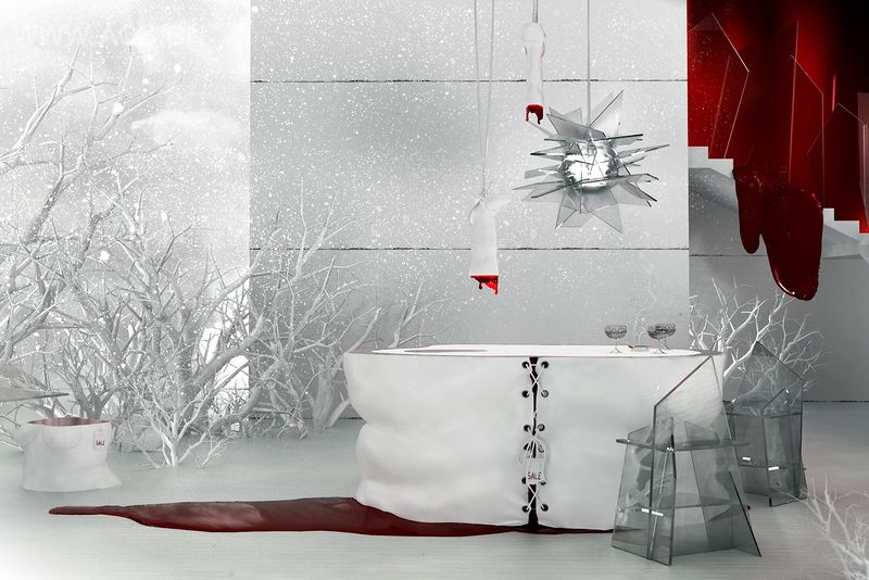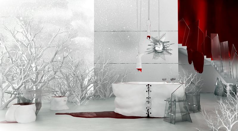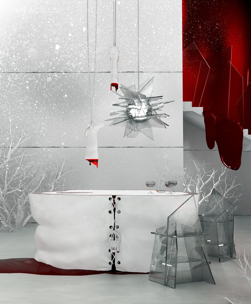 这些白色家具和灯具都是人体部位的缩放,设计中的红色意味着血液。正如所见,有着尖锐边缘的玻璃装饰并不是随机的,而是按照作者的设想,制造出阴森的家具质感。