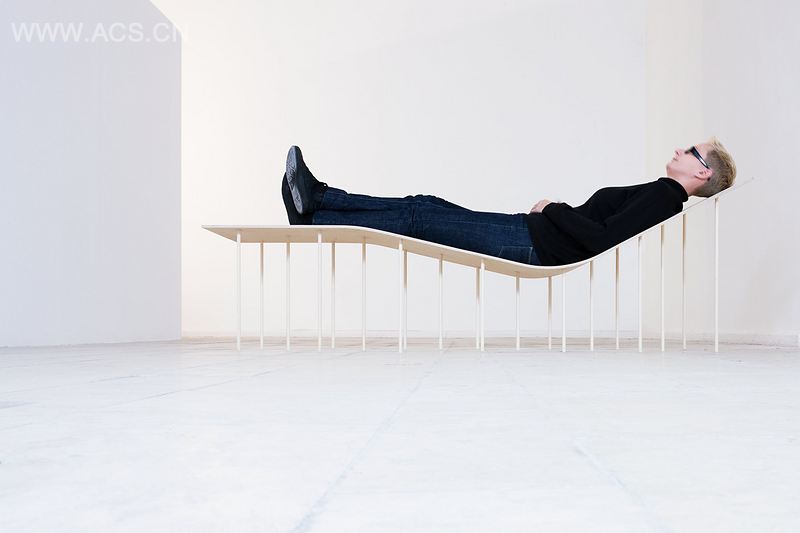 这款漂浮轻便躺椅由一片12mm厚的桦木胶合板和多条12mm粗的桦木棒条组成。虽然胶合面板十分轻薄,但20条支架足以支撑。这些木质支架被牢牢地扣在了钻孔中。这个简单的结构轻便但异常坚固。