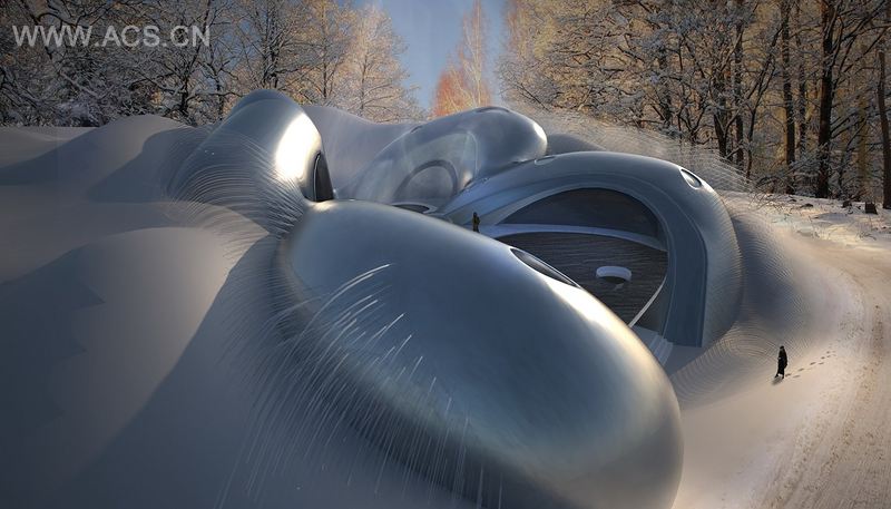 建筑外层以反射环境的不锈钢构成,这种反射表面,目的在捕捉极光和周围景致所构成的实体虚量体化。融入周遭地形之中减少对基地环境的冲击。中间层利用地热来进行隔热系统。
