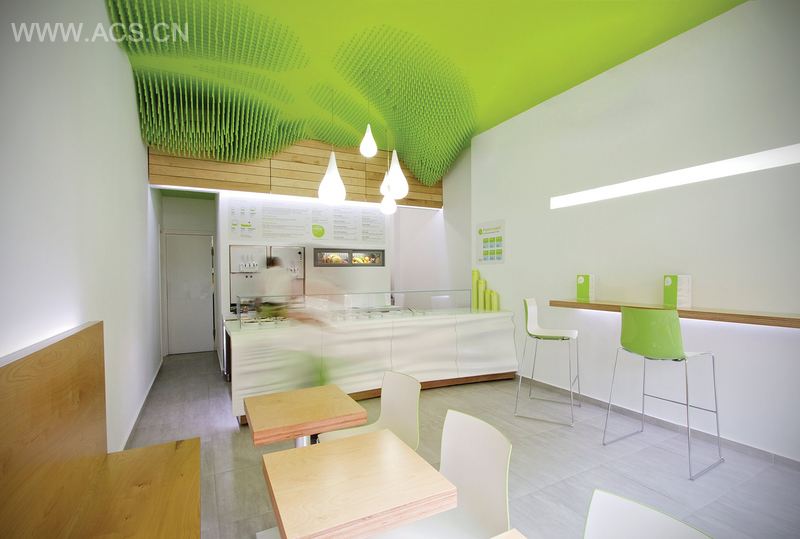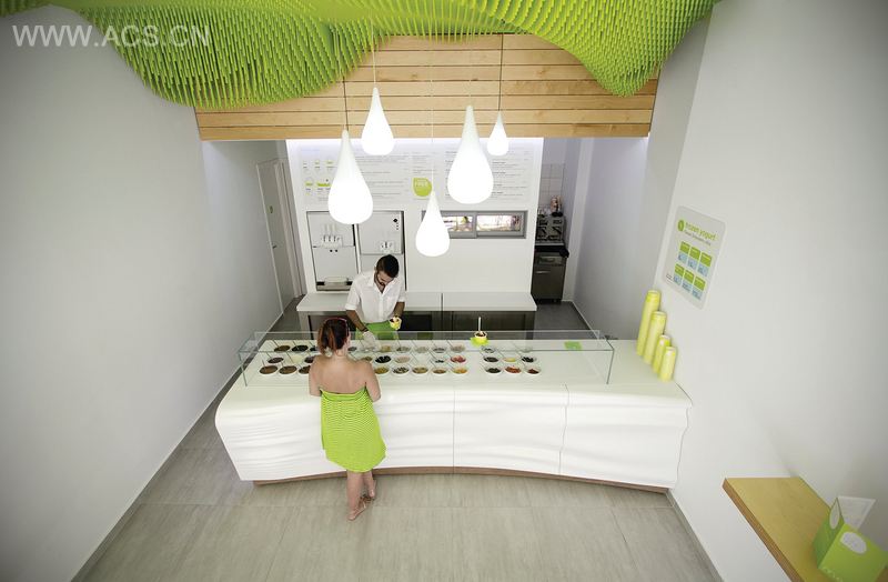 除了酸奶浇头柜台,这件店面应用了一些有别于该品牌其他店面的调整。设计师使用涂成嫩绿色的双曲率天花板,加强了该店面的空间品牌形象。特别定制的倒置天花板营造出froyo yogurteria的绿色景观,将新鲜的产品包覆其中,同时也体现了froyo yogurteria产品皆使用源于自然的原料。