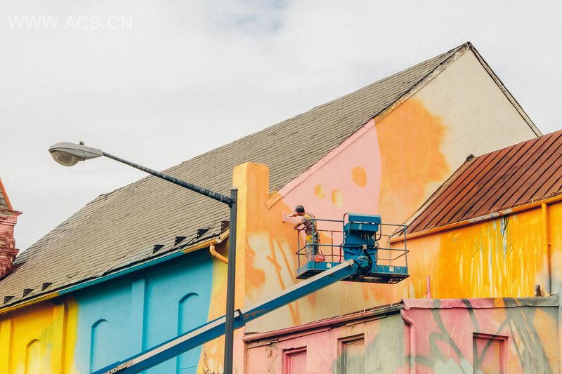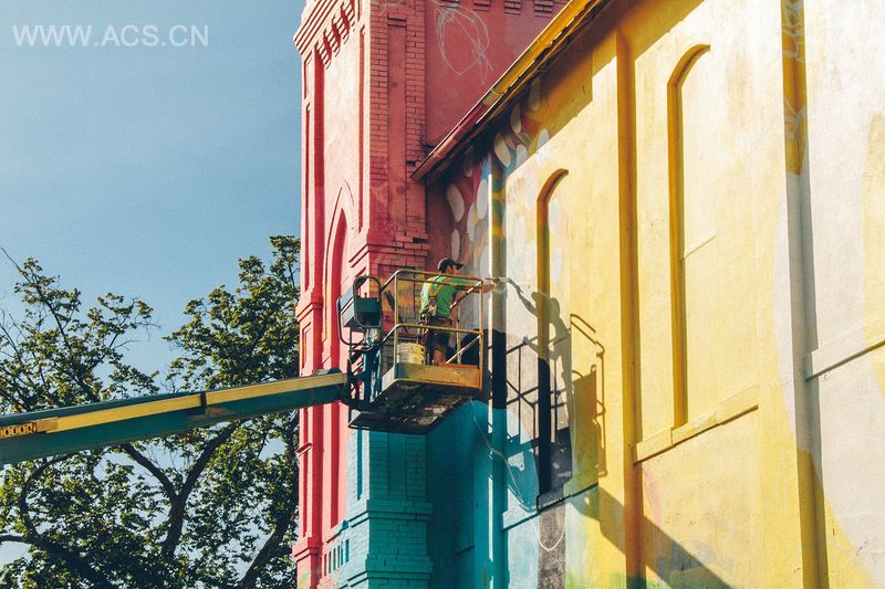 本案是华盛顿特区一个很有意思的项目。设计师和一个小团队一起完成了这个项目。本案位于华盛顿特区西南部,对面是当代艺术博物馆。这一区域拥有巨大的潜力,或将成为下一个艺术特区,本案迈出了第一步,将生活和色彩带入这里。在一栋教堂表面绘画,令其焕发新生,仿若雕塑般。我们想将这间教堂变成一件三维的艺术品。像这样的项目,我们尝试用现有的建筑作为绘画的灵感。我想要使用明亮大胆的颜色,让人在远处即能看到这栋建筑,并被它吸引。我的大部分作品都经过层层涂绘,我并不怕改变。第一步是在建筑的每一面都涂上色彩。然后确定大的形状和图案形态,这一步需要几天时间。整个绘制过程需要好几周的时间。