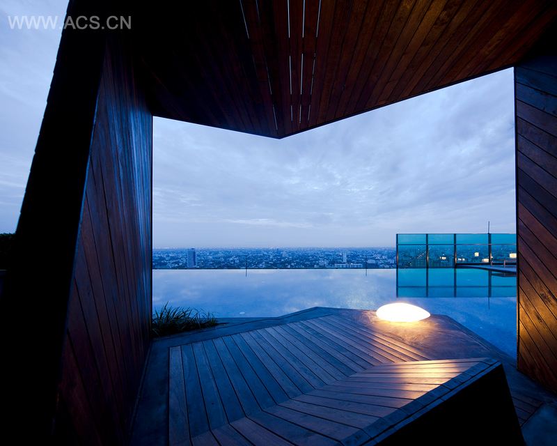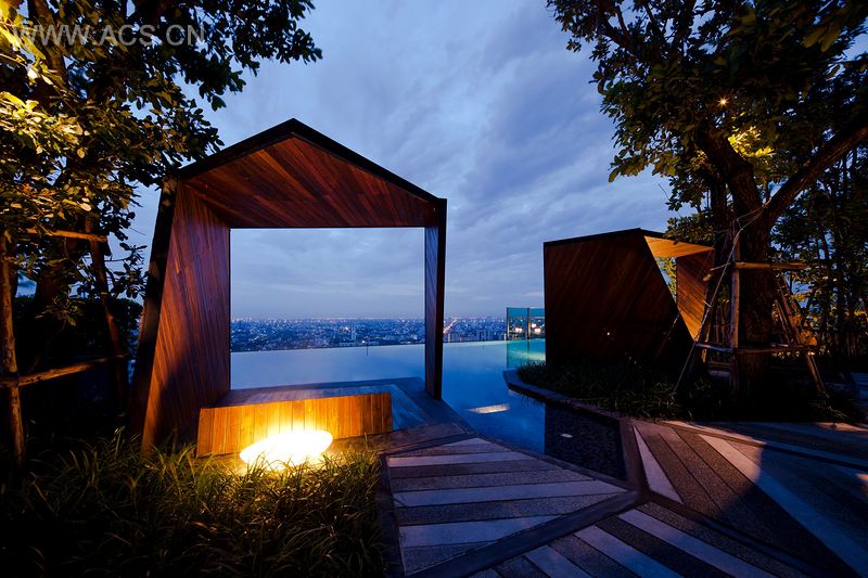 住宅楼顶部的天际甲板能提供180°的曼谷美景,以及为个人、夫妻及朋友提供的完备设施。无边际小型健身游泳池旁的三个更衣室从森林的背景中浮现,提供难得的私人休闲经历。而背面的日落休息椅则可以为一小群朋友们提供了一个户外的休闲空间。
