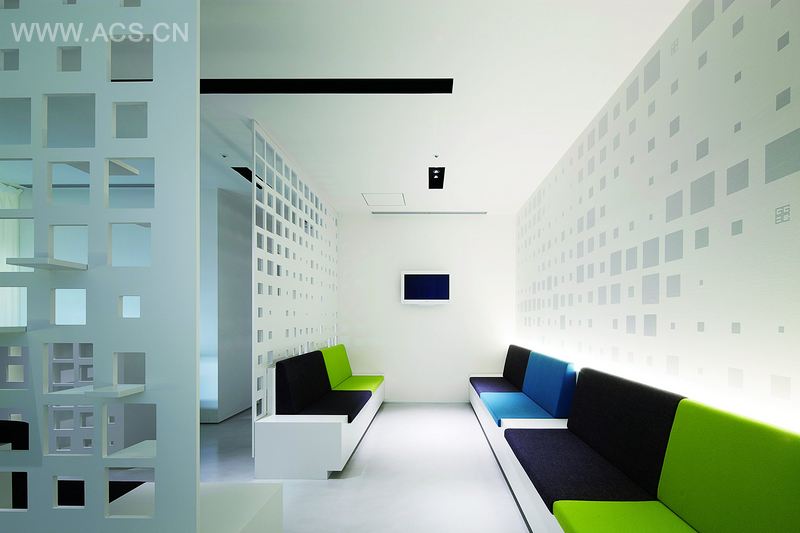 由于男性患者的增多,在G诊所8楼开张后,医生将7楼开辟成男性生发诊疗区。因为男患者的年龄层在20几、30几,他们关注潮流,因此我们通过利用简单的平面几何学原理,尝试以一种不同的方式设计出一个既开阔又相对隐蔽的空间。如果说8楼是奢华,那么7楼就是直白而平易近人的诠释。