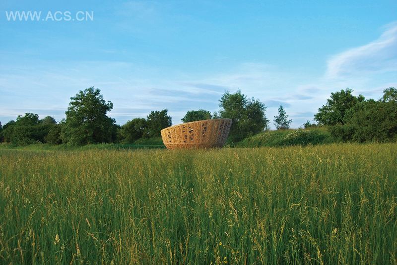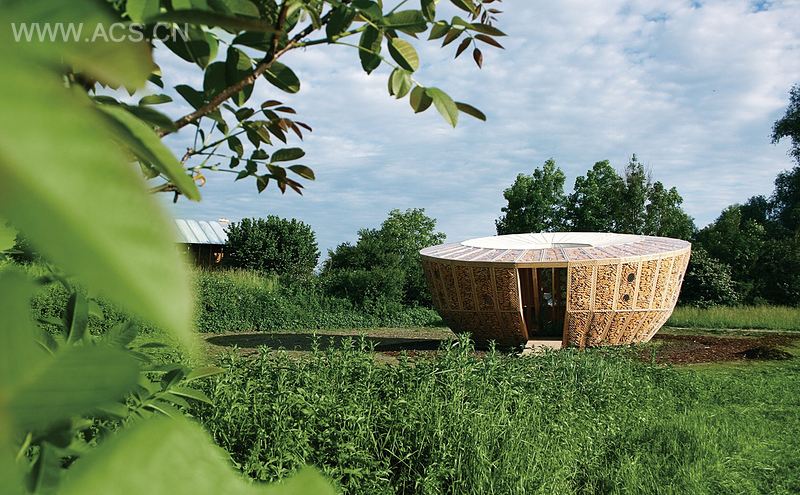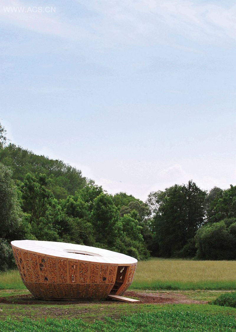 作为 Archi<20 这一竞赛的获奖项目,这个 20平方米的房屋原型坐落于法国东北部 Muttersholtz村庄的自然保护区内,预算为 7000 欧元。设计上采用一种简单但具无限创生性的形状——圆形,使这个展亭能够充分融入周围大环境。
