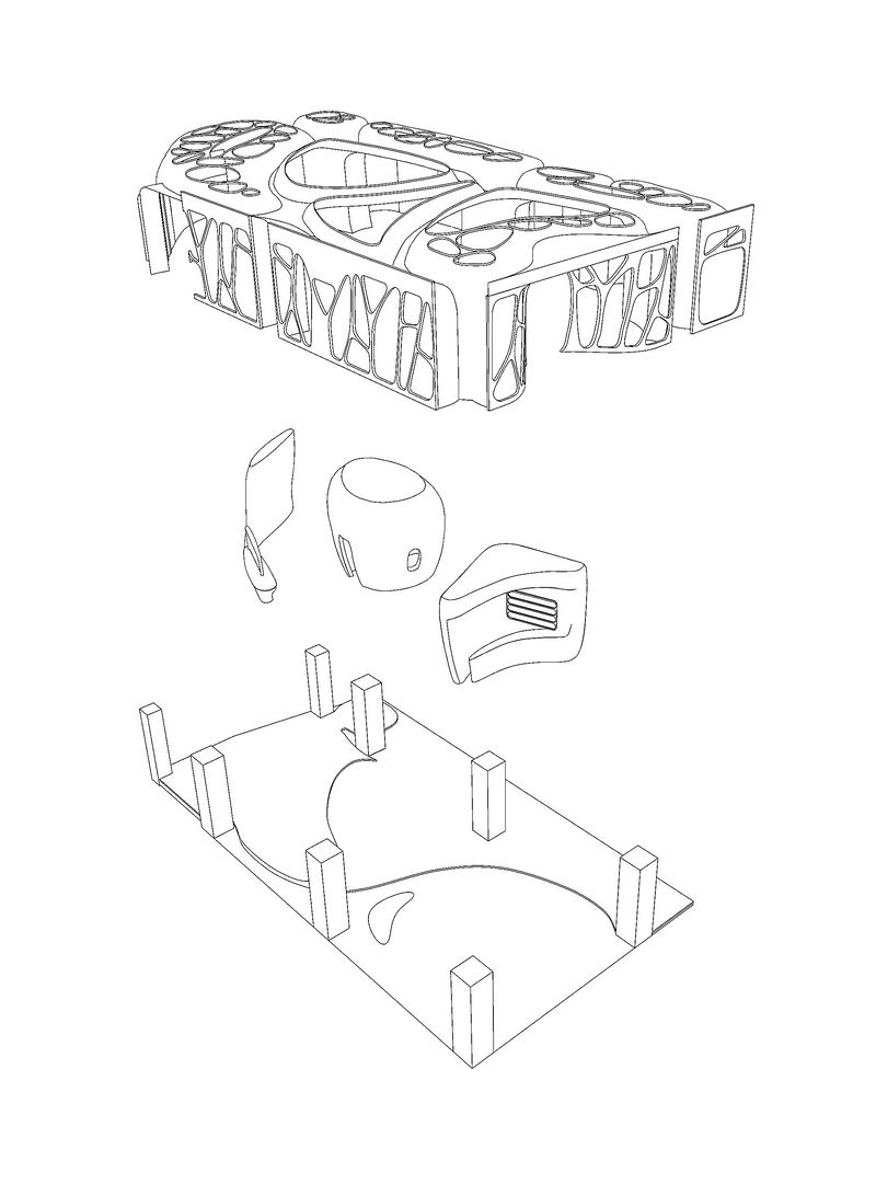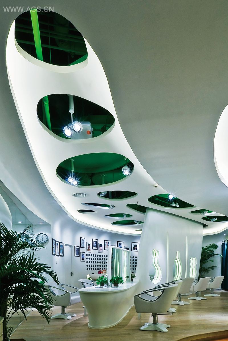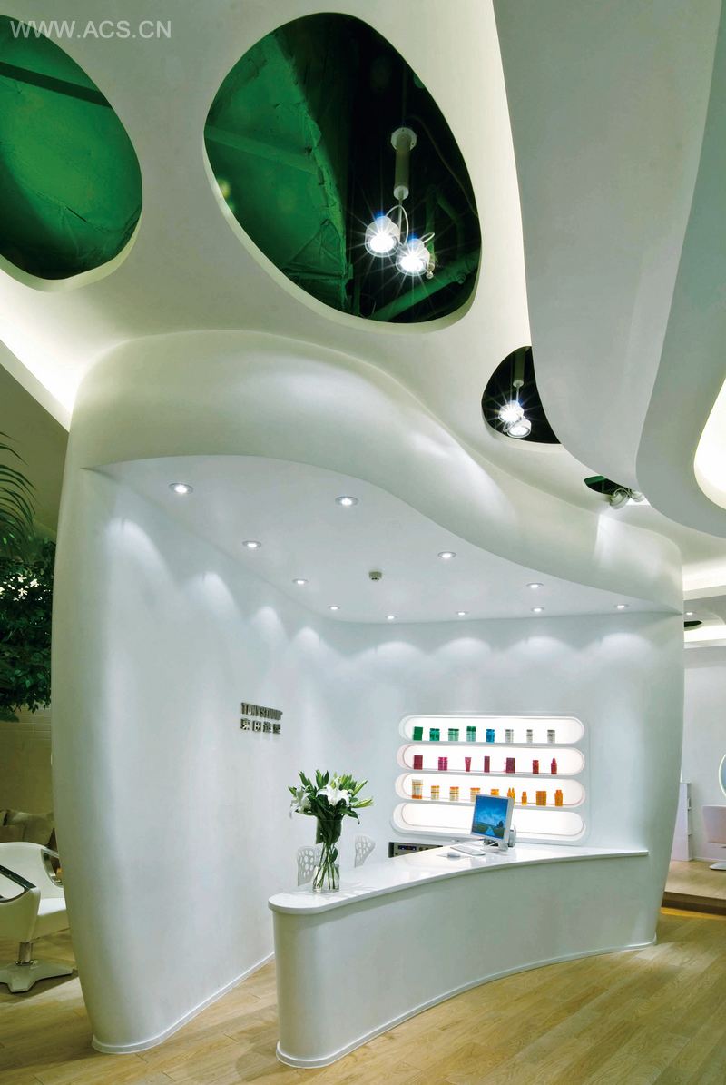 空间中容纳了三个形态各异,互不相连,又有机排列的体量,分别形成了接待区、VIP发型区和染烫区。设计方案充分考虑到这三个实体之间的虚空间的尺度、形态,加上没有一处直角的弧形墙面和贯穿其中的不同高差的地台,形成了一个优美的流动空间。