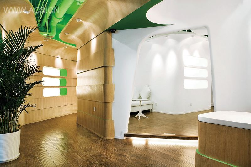 空间设计上将储藏间、休息室、办公室三个需要私密性的房间独立出来,成为空间中形态各异的“细胞核”,延墙曲线生长的墙体打破临街面玻璃幕墙的单调,成为了“细胞壁”。