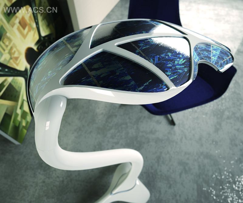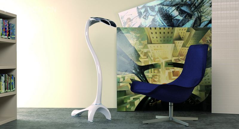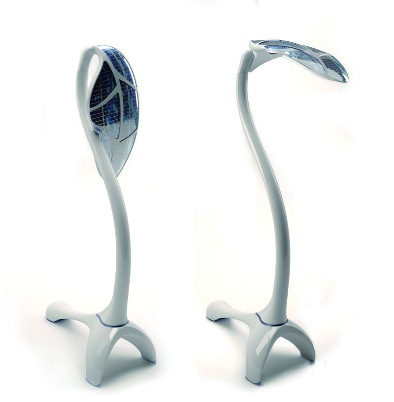 这款灯具的外形的灵感源于根植于大地的植物,有一个可调节的底座,上面带有一个应急充电用的集成电插头,并带有一个装有锂电池的长柄,其顶部是一个叶子状的灵活的光电池板,可以吸收太阳光并将其转化成电能,再送回下面可触摸的亮度调节器的十个LED灯上。在叶子和长柄之间的双重节点可以使Sinthesya落地灯转向各个方向,也可以转向接近太阳能充电的位置。