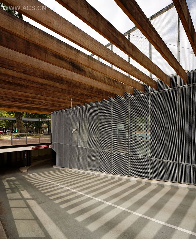 广场呈矩形状,依据功能分为不同区域。其中三个区域是钢梁构造,高出地面4米,与凉亭相连。钢梁的直角区以木藤梁架装饰,使空间具有对比感。入口处是休闲区,钢梁上设有广场及停车场的标识。标识内置有LED灯管,可在夜晚发出光亮,并在不同季节、不同日期呈现不同的色彩。比如,灯光在情人节是红色的,在女王节是橙色的。