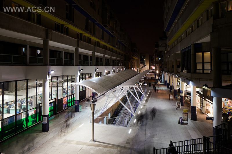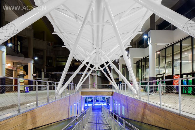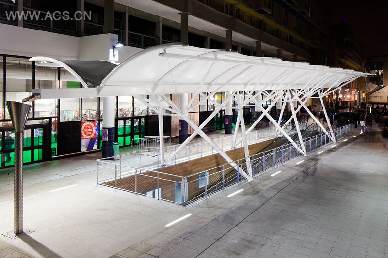 风帆使用的是冷照明,与广场上其他的钠灯照明形成对比。通向购物中心的入口,以彩色灯照明,在不锈钢护栏上留下彩色的反射光,让人感受到地下购物空间的繁华与热闹。