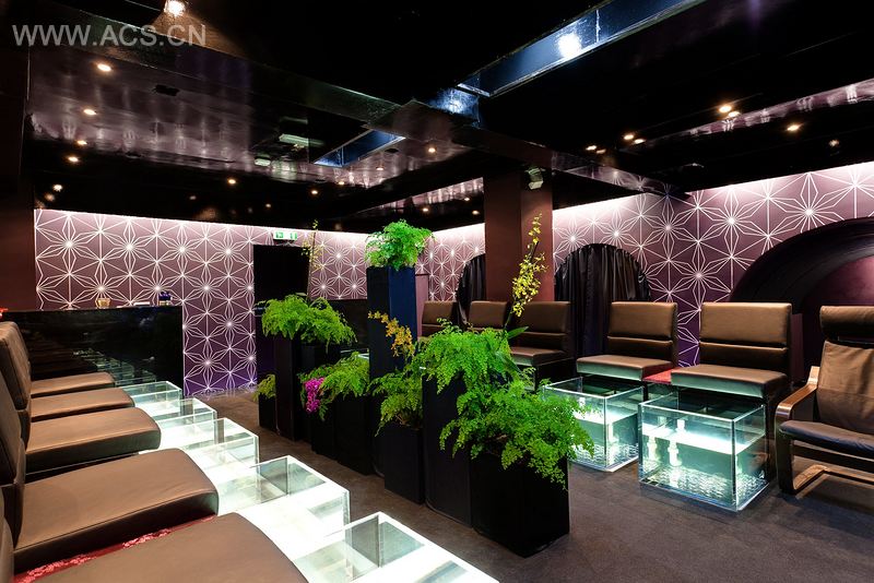 苏豪Aqua Sheko水疗馆的占地,比第一家馆要大得多,像一幅令人惊叹的视觉杰作。鱼缸被运用于整体设计之中,经蓝色光照射,耀眼夺目。紫外线光既能为鱼缸杀菌,又与热带礁石的设计概念相融,射入水面的阳光,反射在鱼的身上,荧光四射。