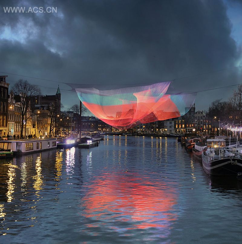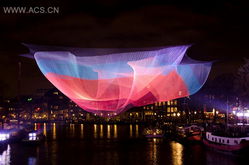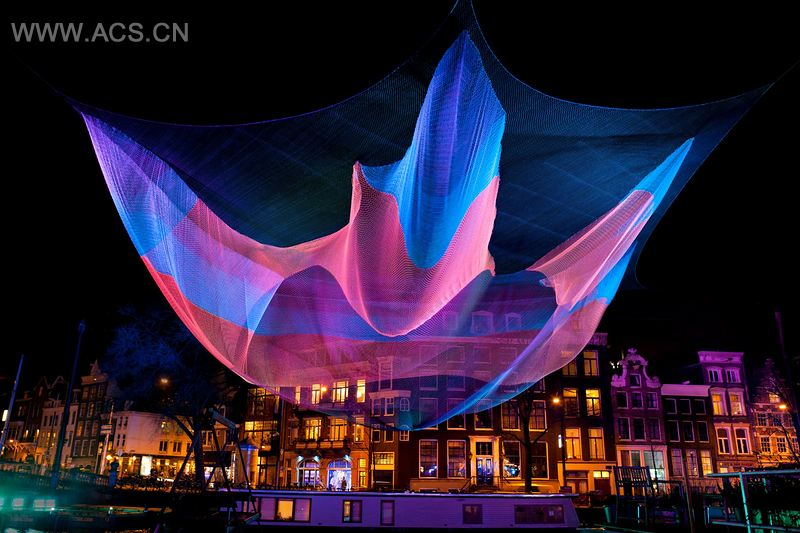 这是出自Janet Echelman之手的空中雕塑,长230英尺,飘扬在阿姆斯特河上方。它完全由软性材料制作而成,比如光谱防弹纤维,比钢要牢固15倍,因此可安全地附在建筑物上而无需额外加固。独特的照明系统使它呈现出不断变幻的色彩,在河水中呈现出多彩的倒影。