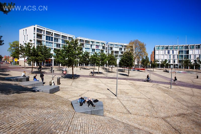 在这个极有年代感的火车站的前方,建筑物呈新月状分布,仿佛庇护着这片广场。广场铺有黄色花岗岩,岩面的裂纹大有作为:可充当排水沟、膨胀缝,也可作树木的保护栅,并可在其上安插灯杆。缓坡上设有低矮的座位,可供行人或坐或躺,在此休息。另设有滑冰池和花岗岩潜水面。红色金属箱可当作座位,并保护着种植于此的悬林木。