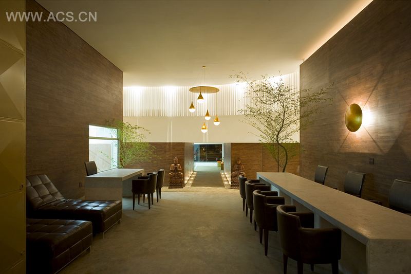 不同层级的天花板,均降低了高度,并换成不同的材质,使得建筑结构大为改观,符合顾客对于水疗会所的审美需求。