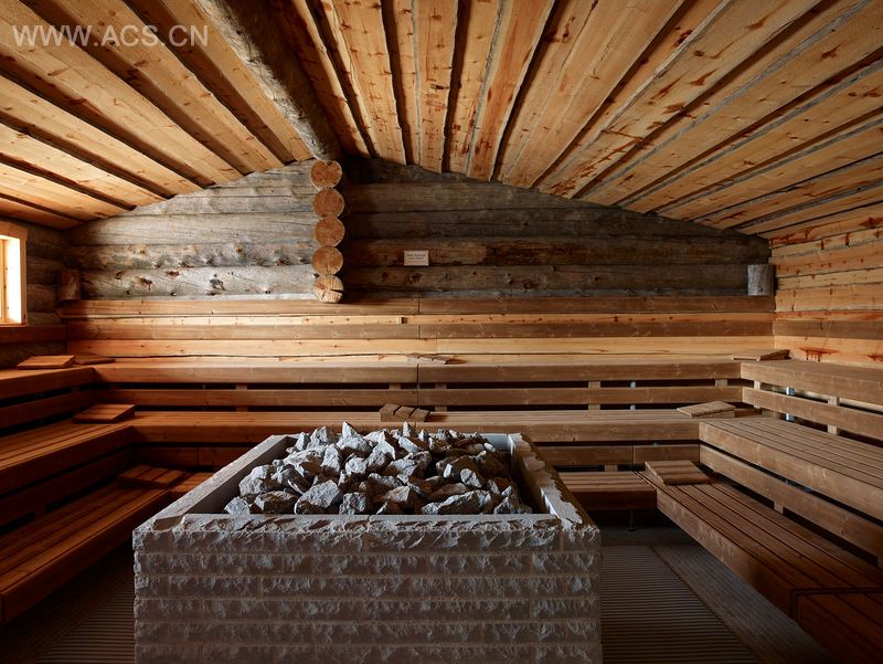 各功能区依不同地形而建,形成清晰、合理的结构。桑拿区向南伸展,融入于原有的结构之中。