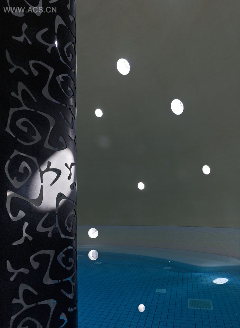 基于对水质的多重要求,室内泳池和水疗区设有独立隔间,波浪式泳池平台将其连接,平台从更衣室一直延伸至大型玻璃花房和室外露台。