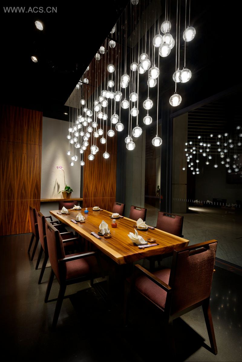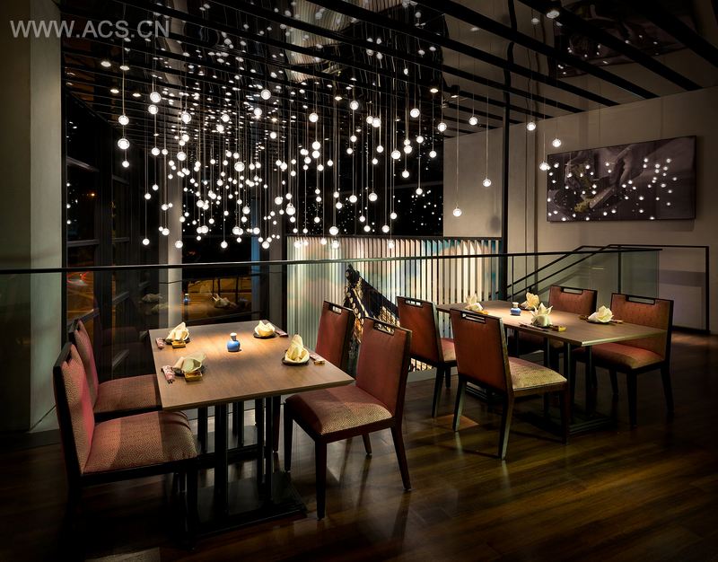 一进入餐厅就会发现,寿司酒吧和服务酒吧都使用固体Suar木材柜台面,台面紧靠着的是纹理石招牌,让人想起日本的茶壶。这些特征贯穿着整个餐馆。冒险深入空间,客人会经验到主要的突出点。特色屏幕上呈现着一张店主前往日本拍摄的照片,照片上是一个支离破碎的寺庙屋顶。往上看,定制的云状玻璃吊坠闪烁在整个空白空间,在天花板的镜面天窗上映现出来,塑造出一种神奇的印象。日本烹饪作品的照片让厨房与餐厅空间连为一体,在烹饪照片里客人会发现令人难忘的美食的制作过程。