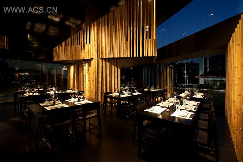 照明定向而集中,呈现美丽的竹子,突显出餐厅的温暖与黑钢、地板的对比。