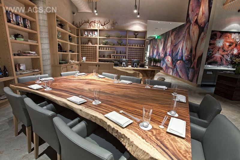 一副红色鱼躺在冰床上的巨大壁画贴在入口大厅的墙上,另一副五颜六色的章鱼迎客的壁画贴在酒吧前台,透过前窗可见。这些惊人的意向让人想起日本露天鱼市,在那里,各种颜色和样子的生海鲜陈列着。要到主餐厅,客人必须经过大型开放式厨房,在那他们可以看到行动和兴奋。这也让人想起亚洲鱼市,在那里食品按客人的需求而准备。