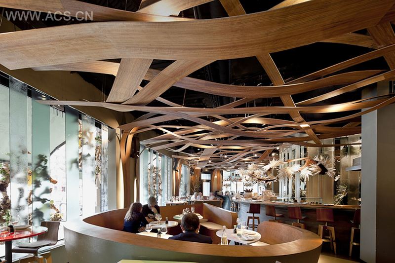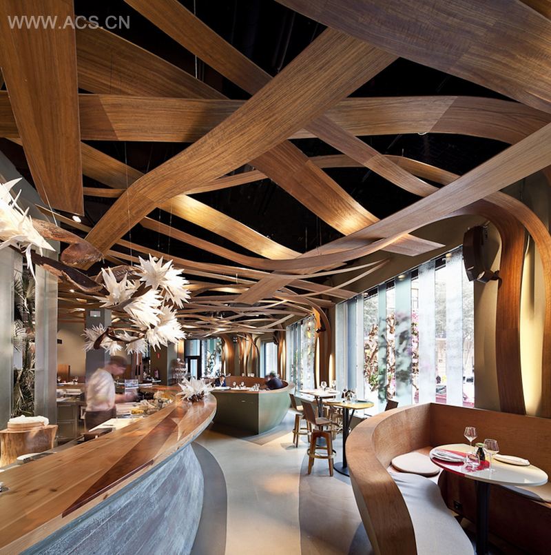 巴塞罗那Ikibana Paral 餐厅将日本和巴西风格相融合:木元素形似森林的天花板成为空间的主角。而这两者之间又存正着显而易见的大不同:前者安静、简约,而后者则是奔放、热烈的。餐厅设计过程中最大的概念挑战就是如何寻找出两种文化间的共同点。作为一个巨大的挑战,它也成为了项目的主题,因为我们发现景观是在两种文化间一个极其重要的关键元素,我们决定在设计空间中突出这个元素,创造一个人工景观。