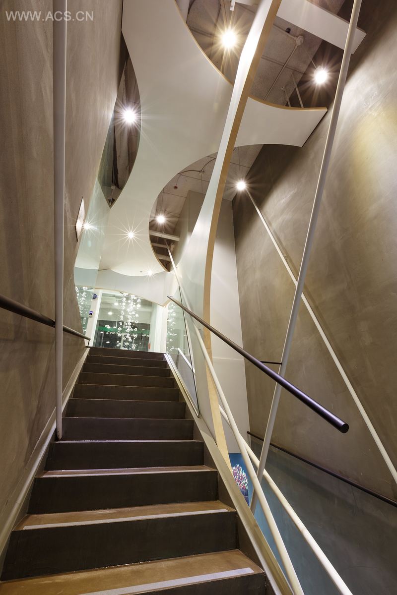 楼梯像一条通往内部空间的小径一样。树状结构和从内部伸出的树枝使人联想到美丽而神奇的森林。