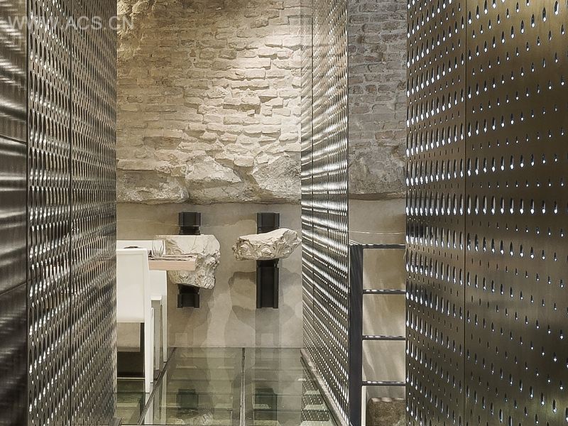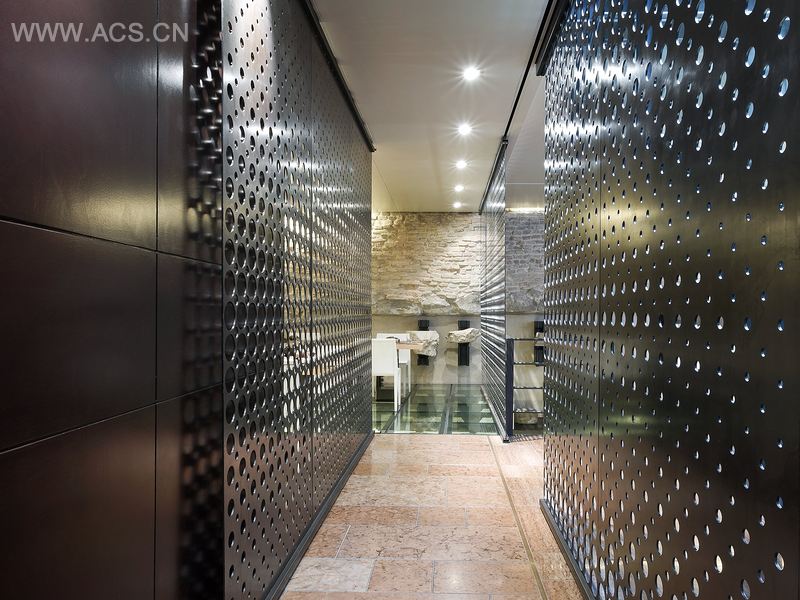 穿孔的几何形状在尺寸上特意制作的各不相同,使得人们的目光可以直接落到后台的古制品上。