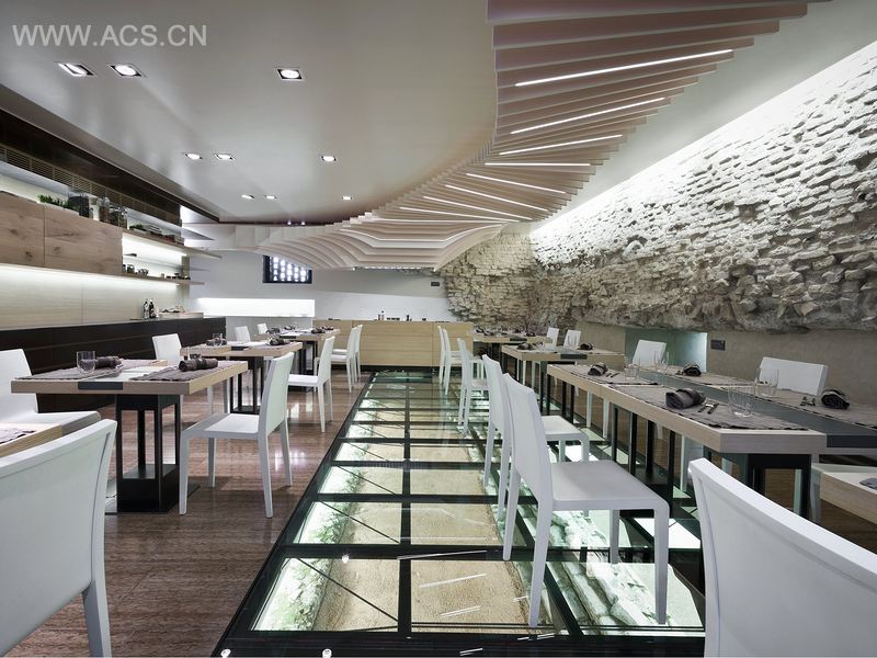 照明设备安装在镜子旁边,并与楼层中已安装的玻璃开口交相呼应,用餐者通过此即可看到罗马遗迹。入口处很窄,越往后越宽敞,直到Teppanyaki。与通风系统整合,将就餐者的眼球引向Teppanyaki的主要聚焦点。照明设备弯弯曲曲照亮了一边的罗马城墙,以及另一边的主要餐厅区。带状元素的每个面由不同的颜色(店内的标识颜色)构成,从这个侧面给人一种柔和的气氛,而从另一面则带来令人兴奋的更现代的感觉。