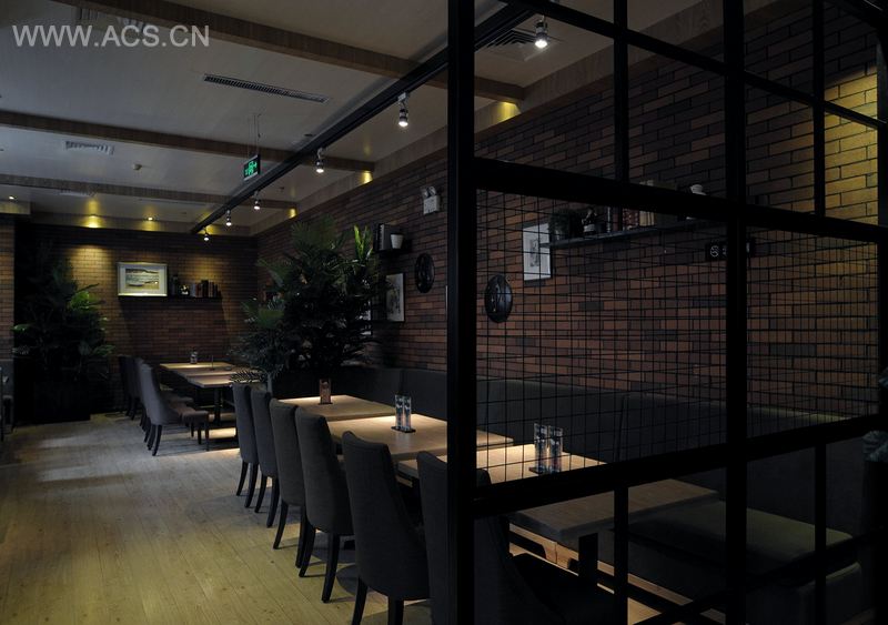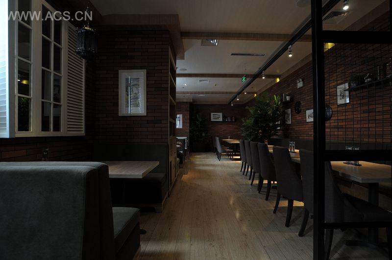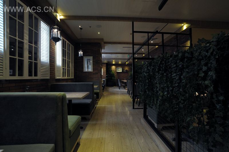 作旧处理的木地板与红色通体砖的大面积使用,使得整个餐厅在个性时尚之余,多了几分的怀旧情怀。白色百叶窗与绿叶造型的隔断提亮了整体空间的清新感觉,使人在此用餐时更为舒畅。