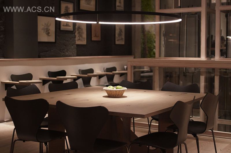 餐厅被一个露天酒吧和两个连接着地下面包店和地面餐厅的玻璃电梯环绕着。玻璃电梯成为餐厅的焦点,在两个主要的方案组成部分间——面包店和餐厅——传输面包和糕点;在永恒的运动中,玻璃电梯是空间充满活力而迷人的元素,透过玻璃可以瞥见下面的面包店,看到糕点师傅的面包和糕点制作。