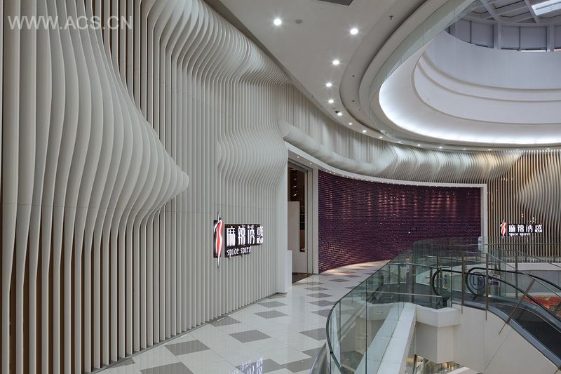 餐厅有三个餐饮区,装饰着两个元素。一个元素是白色的法国曲线。木板间的镜子强调太极中女性柔软的观点,曲线形状来自麻辣诱惑的商标。利旭恒以现代技术用女性身材的曲线美诠释品牌形象。大量的曲线用于墙壁和天花板,突出了人体美学;由垂直曲线形成的叠层,也在水平表面产生曲线,形成令人难以置信的简单而自然的源于女性身形的结构。