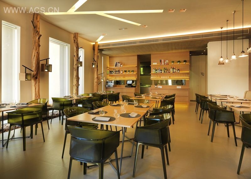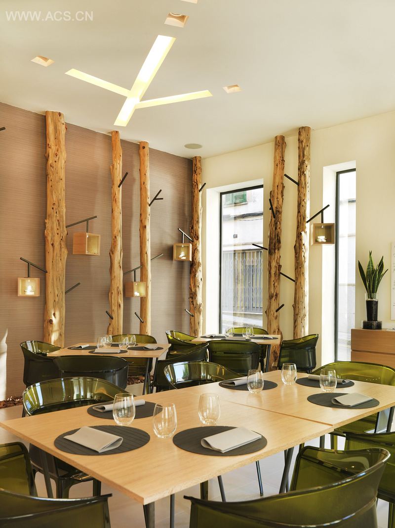 在通往主厅区的橡木入口上,雕刻着餐厅名字Joan March 的艺术字,主厅区新安装着高而窄的窗户,让食客能欣赏到外面的风景,同时,人一般长短的树杆用来装饰室内,让人产生无限的幻想。