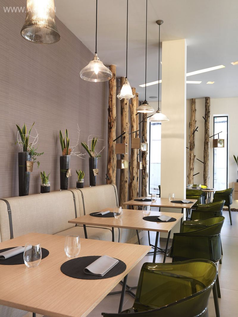 主要餐厅分为三个区域,首先是一个沙发座位区,有一组古灯照亮这里;主餐厅区,Kartell的橄榄绿Papiro椅子围着特别的设计桌子和最后一个锻铁长椅。房间然后与树皮做的沟渠接壤。
