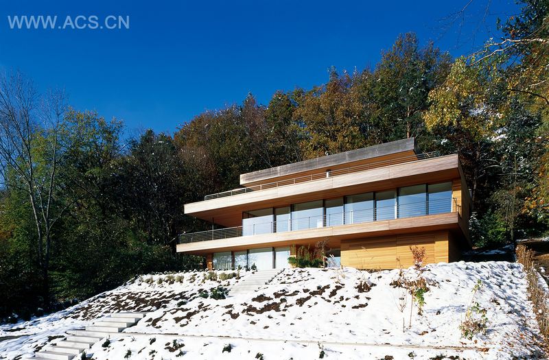 海尔布隆房屋三层住宅楼坐落在海尔布隆郊区森林边缘的斜坡上,房屋向南而立,可以纵览周围壮观的景致。悬浮式设计及混凝土、玻璃、铜和落叶松等天然材料的使用,尽显单身贵族的居住风格。除了接触地面的结构元素,房屋其余部分均采用了木质材料建造而成。
