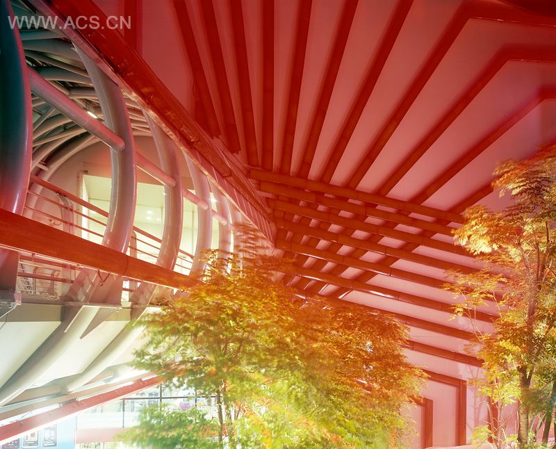 动感的红色灯丝(实际上是发光的二极管)给整个建筑体添加了条纹,并由此形成了一种延续性的窗格图案。从广场和人行桥开始,购物中心的韵调和图案从头到脚地支配了整个项目。这个项目的红色给人一种活跃而自信的感觉。
