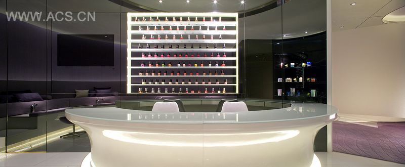 美甲吧临近入口门厅,曲线处理缓和了空间的不规则感,并增加了空间的柔和感。